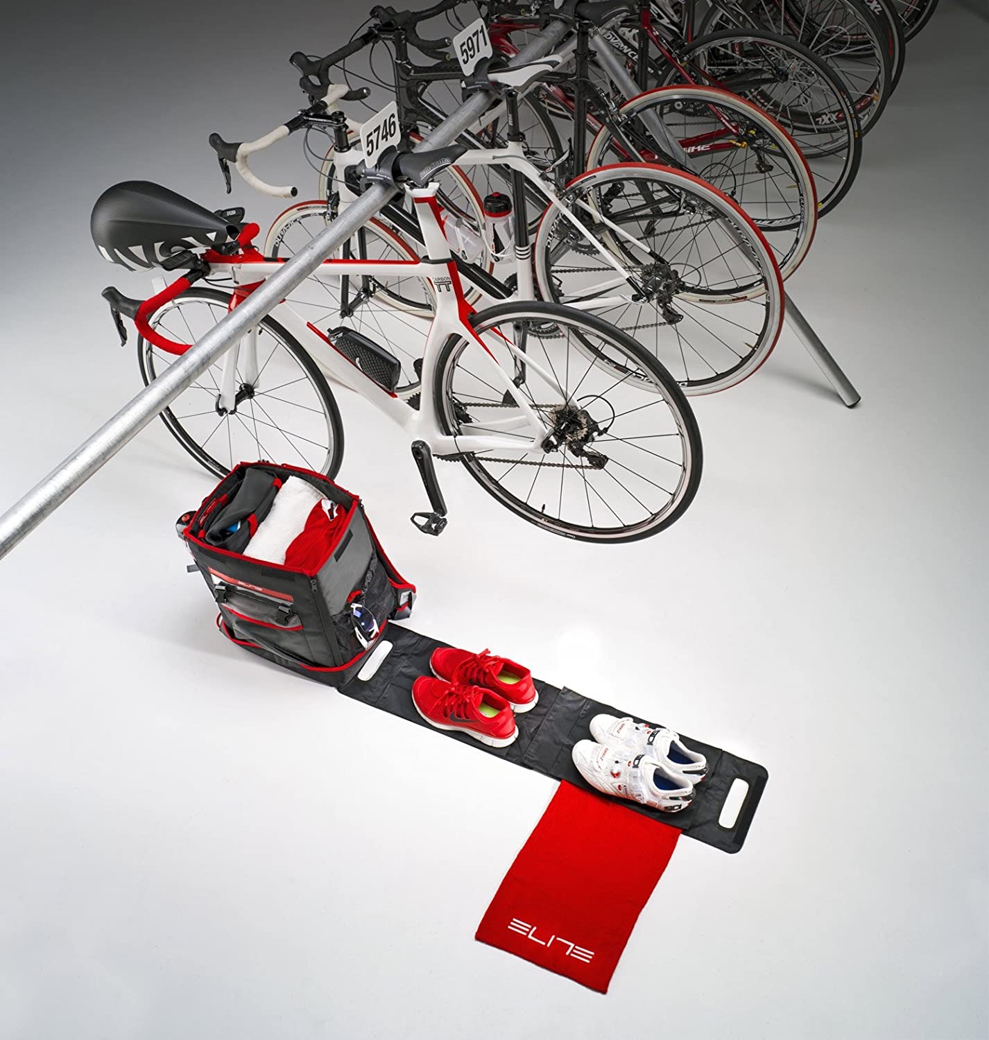 افتح الغطاء بتدويره، شيل كيسين الأحذية، فصل كيس T1، علق أحذية الدراجة على الدراجة، حط كيس T1 الفاضي داخل الكيس وحط بس كيس T2 للأحذية قدام صندوق الترياتلون.